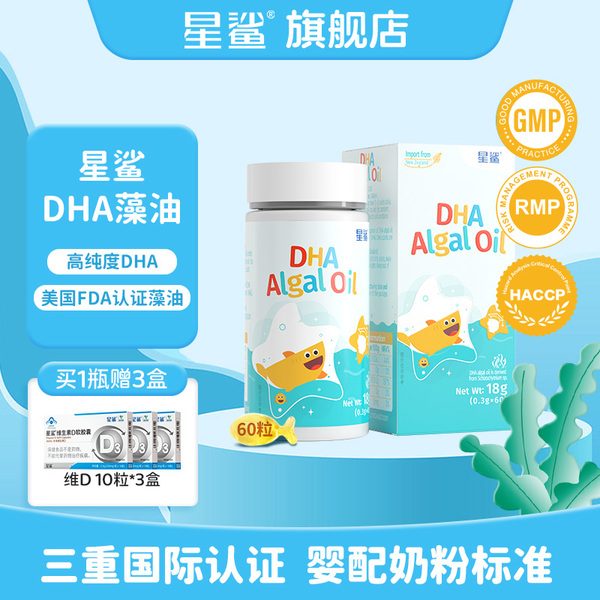 【到手价159叠金币14.1vip到手136.9/瓶60粒每粒135mg高含量赠维d10粒*2盒】星鲨DHA藻油dha儿童孕妇进口海藻官方婴幼儿宝宝正品。